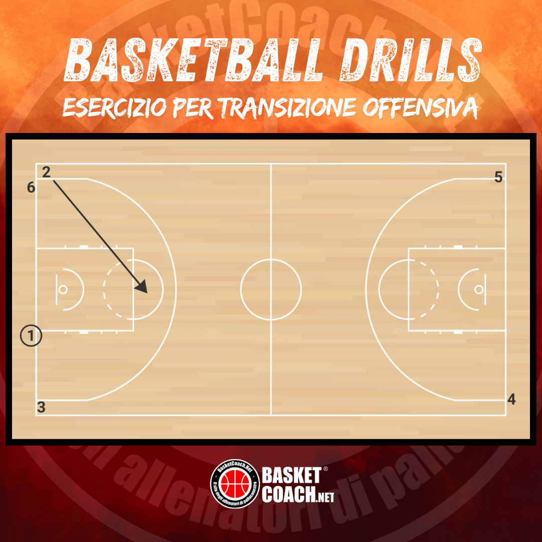 I giocatori 1 e 2 passano la palla a 3 e 4, corrono verso il cono dove ricevono il passaggio di ritorno. Quindi eseguono una partenza e vanno a canestro. Dopo aver tirato, prendono il rimbalzo e passano la palla ai giocatori 3 e 4 e cambiano posizione con loro.
