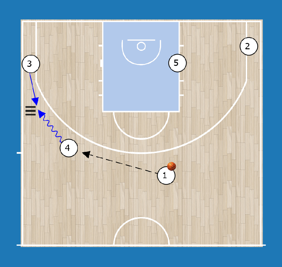 FLOPPY STEP-UP PNR 1 e 5 giocano pick and pop. 3 taglia sotto al canestro. 4 scende in post basso.