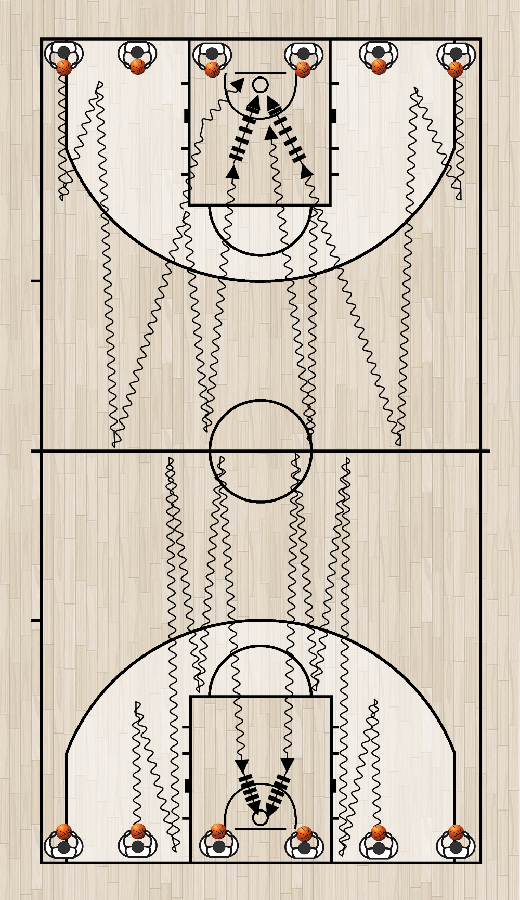 PALLEGGIO CON CAMBIO DI MANO E DI SENSO Cambio di senso e di mano (sempre guardando i canestri). Tutti con palla a mezza velocità, usano le linee del campo, come nel diagramma, e finiscono con un tiro a canestro. In pochi minuti capitalizziamo centinaia di palleggi e decine di tiri. Non dimentichiamo mai che gli allievi vengono in palestra per tirare a canestro!