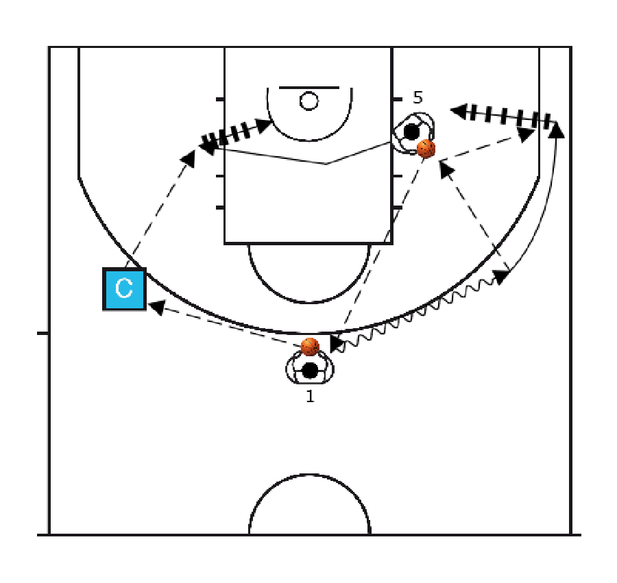 A coppie, un giocatore nella fascia centrale del campo con un pallone, mentre l'altro si dispone sul prolungamento della linea del tiro libero ed al di fuori della linea del tiro da tre punti. In quest'esercizio si lavora sullo smarcamento in ala.