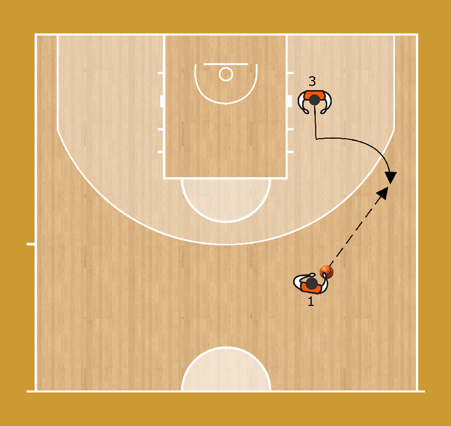 Tre giocatori attorno al perimetro ed un post basso. L’allenatore passa a 1, che palleggia verso l’angolo per passare a 4 in post basso, 4 passa a 2, che passa a 3 e 3 tira.