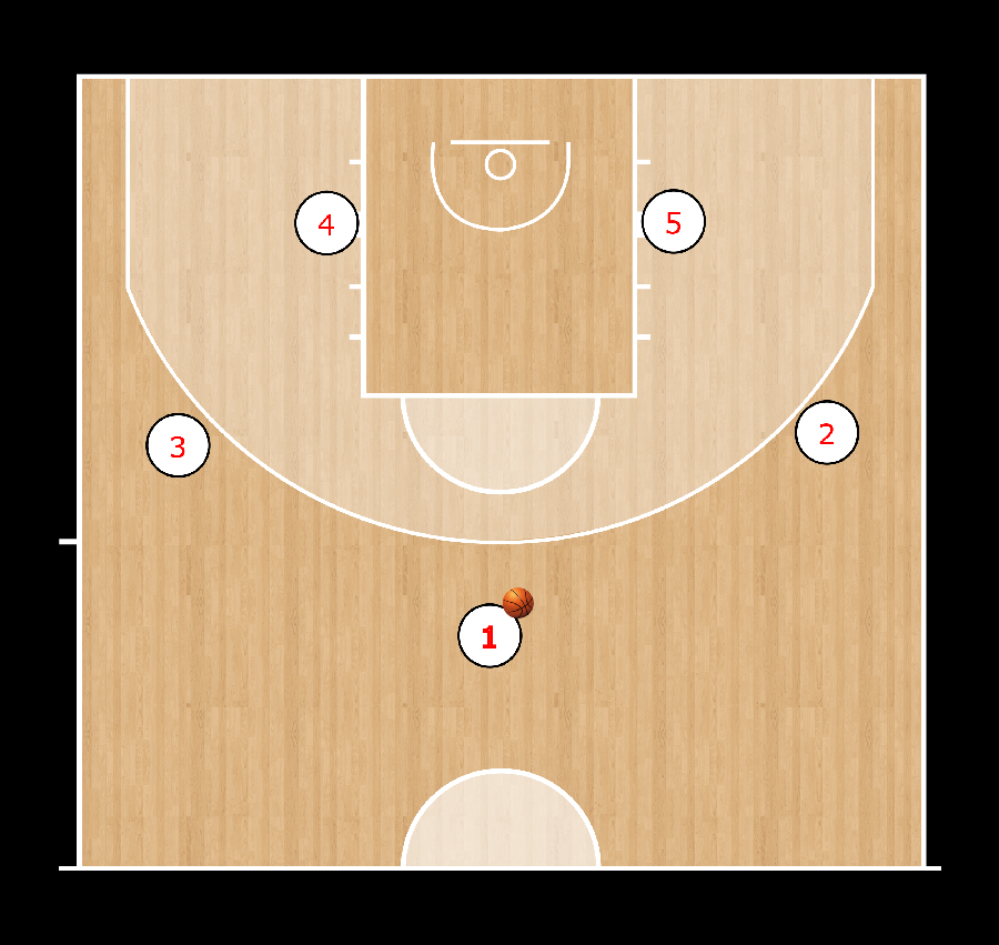 Palleggiare con cambi di direzione e cambio di mano. Sul lato sinistro del campo, cambio di mano sono sul gomito della linea di tiro libero, sulla fila di metà campo e sull'altra linea di tiro libero e si conclude con un tiro a canestro. Sul lato destro, cambio di mano sono più vicini e sono in numero maggiore. Alla fine, c’è sempre un tiro a canestro. Usiamo cambio di mano frontale, tra le gambe, dietro la schiena e giro in palleggio.