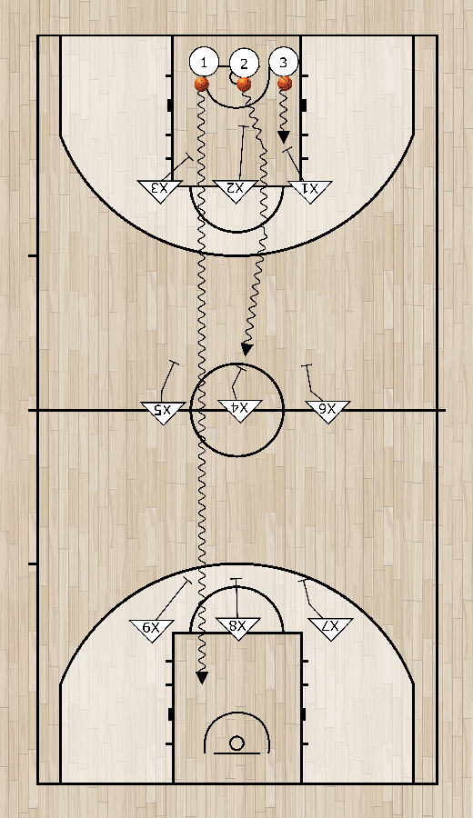 Un esercizio di 3 contro 3 con ricezione libera è utile per insegnare al playmaker a battere in palleggio il difensore per creare sovrannumero. Diciamo a X2 o X3 di aiutare perché il playmaker sappia selezionare quale passaggio fare al compagno libero.