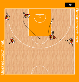 DIAGRAMMA 18: Alto-basso (B). 5 passa ad 1 in ala e poi taglia in posizione di post basso e chiama la palla per giocare un 1c1. 4 taglia dal post basso di lato debole verso la linea del tiro libero. 1 ha due possibilità di passaggio: a 4 che taglia flash o a 5 in post basso.
