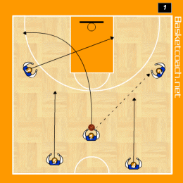 Quando arriviamo in attacco e’ importante allargare subito il campo, andando ad occupare la posizione di post medio se il giocatore in ala non attacca il canestro. Nel fare questo e’ consigliato fare un taglio da lato debole cosi’ da poter sfruttare un movimento dinamico per aprire una linea di passaggio diretto (diagramma n.1).