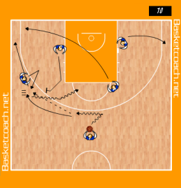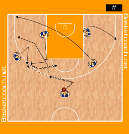 DIAGRAMMA 11: se la difesa ostacola l’handoff tra 3 ed 1, sarà direttamente 3 a giocare Pick & Roll con 5 mentre 1 andrà ad occupare la posizione di angolo pronto a salire sul gioco a due per fare da sponda.