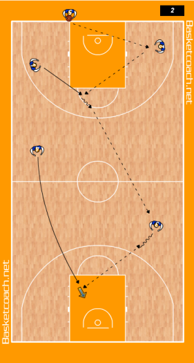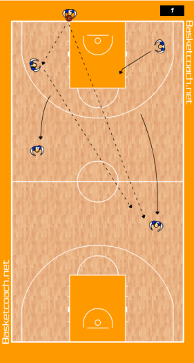 Prima possibilità per 5 passaggio lungo diretto a 3, che intanto è "scappato" in contropiede, per una soluzione rapida. Se non c'è il passaggio lungo a 3 apertura su 1, che può a sua volta lanciare 3 a canestro per una soluzione immediata.