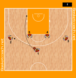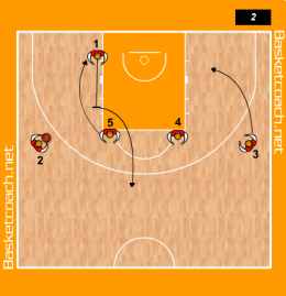 DIAGRAMMA 2: Pugno (B). 1 torna alto e porta un blocco cieco per 5. 5 taglia in post basso e gioca per ricevere da 2. 1 si apre in punta. Mentre ciò accade 3 si vuole verso le tacche dell’area sul lato debole.