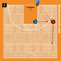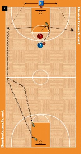 Il giocatore in difesa, terminata l’azione, deve uscire velocemente sul lato dove si è spostato il Coach che, con un secondo pallone, eseguirà un passaggio dallalinea di fondo. L'apertura deve essere presa con le spalle alla linea laterale e sul proseguimento della linea di tiro libero, comunque non oltre. L'apertura del palleggio è con la mano esterna e la palla rimane sulla linea laterale fino a metà campo, dove si deciderà se proseguire e chiudere l'azione con un tiro laterale oppure cambiare mano e chiudere l'azione con un arresto e tiro sul gomito del tiro libero. Il palleggio con la mano esterna è preferibile ma non vincolante.