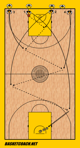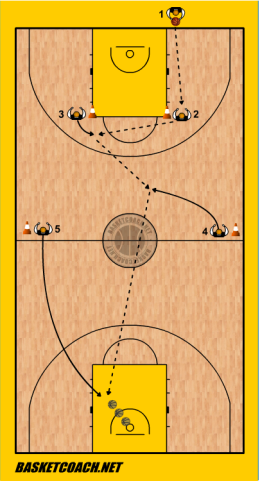ESERCIZIO 1 - Attacco al pressing Giocatori disposti come da diagramma. 1 fa rimessa verso 2, 2 a 3, 4 viene incontro alla palla centralmente per ricevere, 5 corre verso canestro per ricevere un passaggio lungo da 4 e concludere.