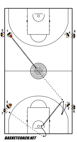 Descrizione: il giocatore con palla parte in palleggio nella corsia centrale, esegue un passaggio al giocatore della fila senza palla nell’altra metà campo, che nel frattempo sta effettuando uno smarcamento. Dopo il passaggio, chi passa la palla, va nella fila senza palla, chi riceve il passaggio, attacca il canestro, esegue un tiro, poi effettua la rimessa con passaggio di apertura, all’ultimo giocatore della fila con palla (come detto sopra l’ultimo giocatore della fila con palla deve esserne sprovvisto). Ogni volta che un giocatore supera la linea di metà campo, parte quello dietro. In continuità.