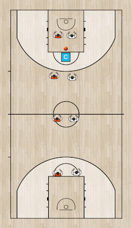 Disposti a coppie, una sotto canestro, una sul tiro libero, una a metà campo e l’ultima sulla linea di tiro libero opposto.