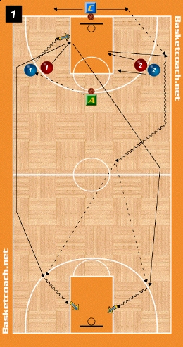 D. 1 - L'esercizio inizia con l'appoggio che passa la palla al primo dei due attaccanti che si smarca. L'azione di 2c2 è libera quindi i difensori, al termine dell'attacco, potranno trovarsi in qualsiasi zona del campo e soprattutto il Coach potrà decidere il Iato dove fare la rimessa. Il giocatore più vicino alla palla prende il passaggio di apertura, l'altro vola velocemente all'altro canestro occupando una corsia laterale a scelta.