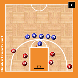 (Diag. 1) Dividere la squadra in due gruppi. Un gruppo comincia a tirare, l�altro comincia a disturbare. I giocatori della squadra che tirano hanno due tiri liberi a testa; la squadra dei disturbatori pu� infastidire il tiratore, senza toccarlo fisicamente e senza entrare nella lunetta. Se il tiratore fa 2/2 la squadra dei disturbatori fa due campi di corsa. Se fa 1/2 entrambe le squadre corrono un campo. Se fa 0/2 la squadra dei tiratori fa due campi di corsa. L�esercizio finisce quando tutti i giocatori hanno effettuato tiri.